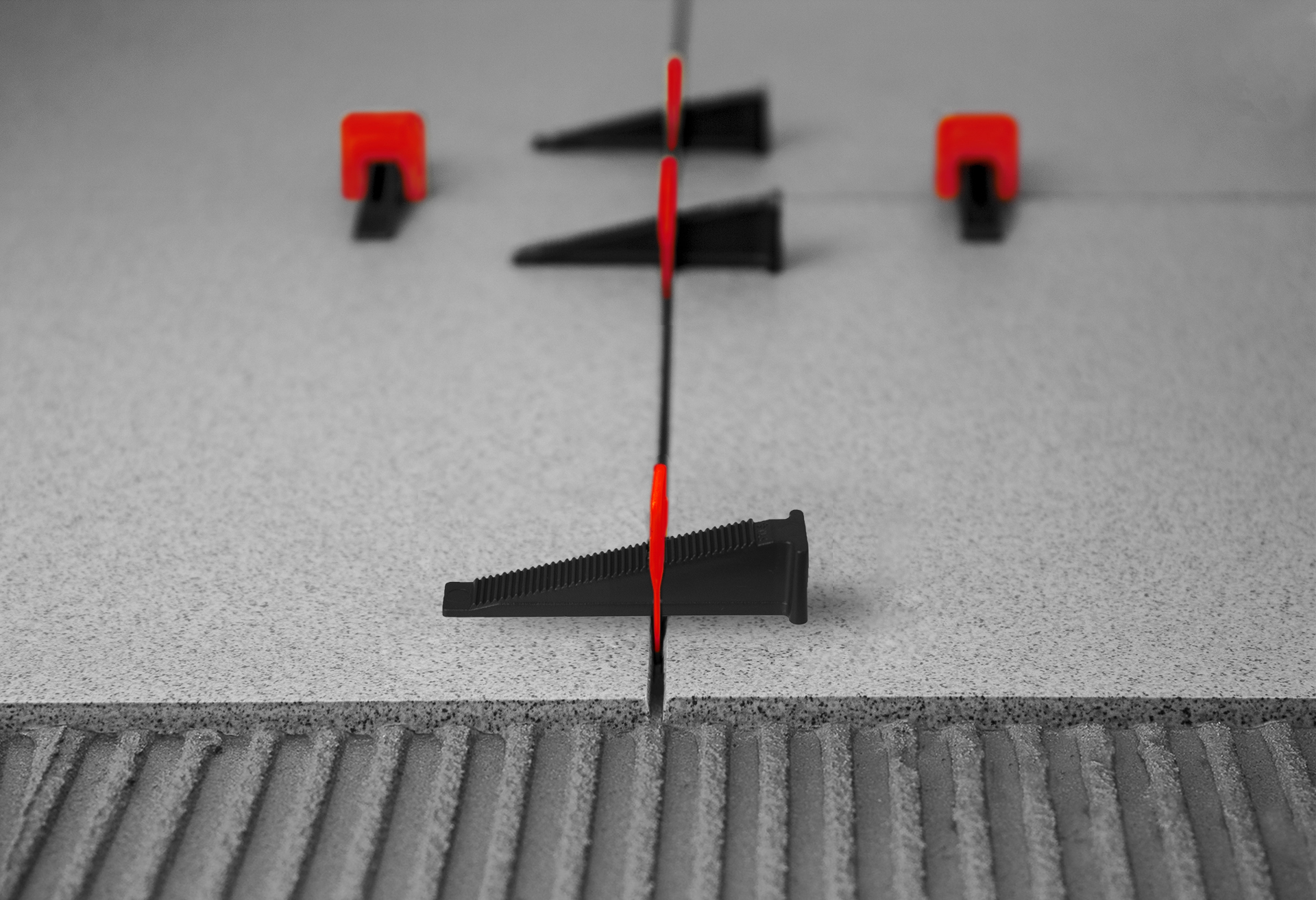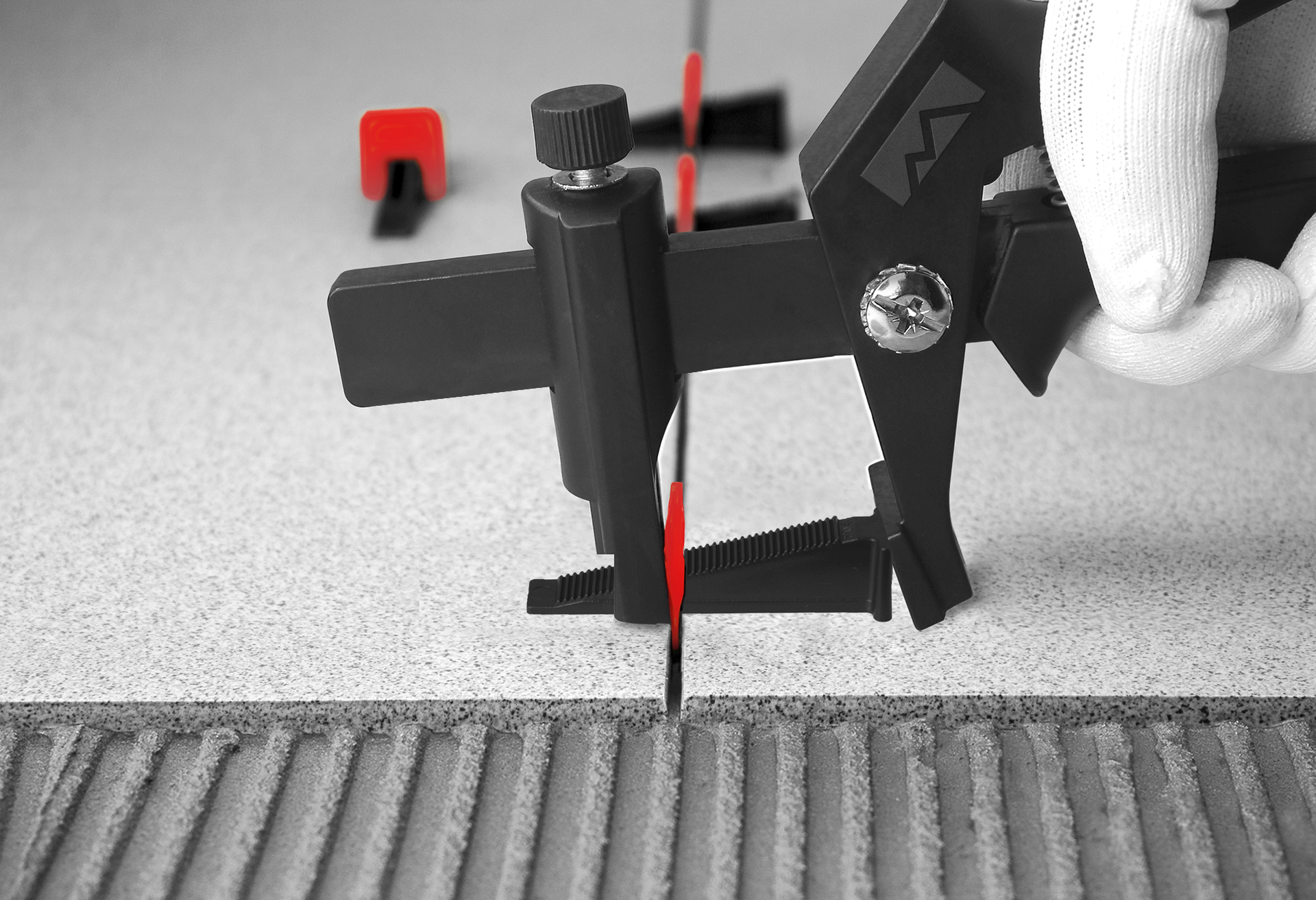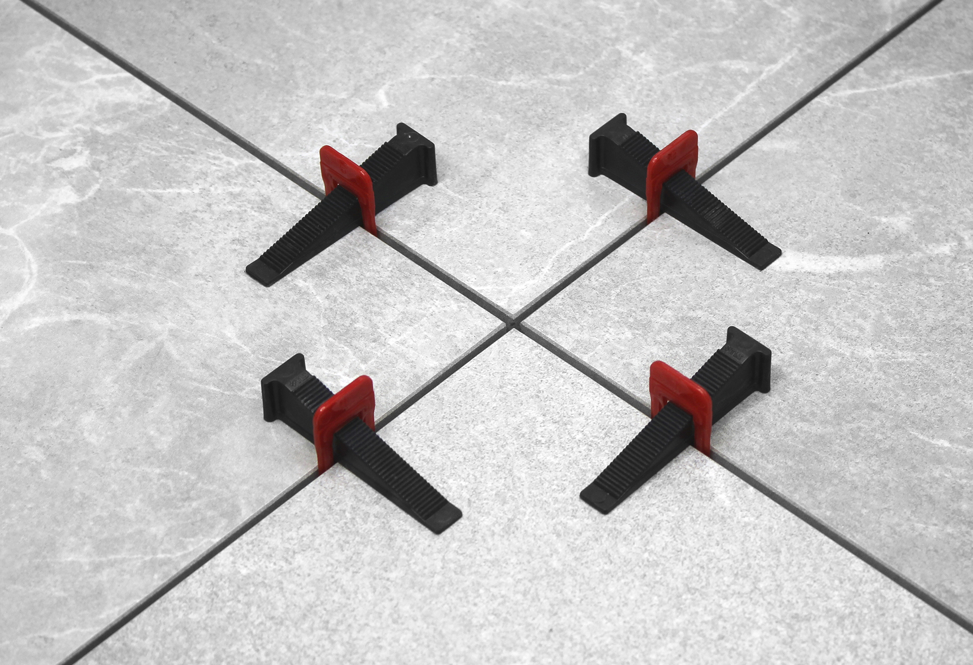 - При сложной раскладке и неровной плитке количество зажимов нужно увеличить. В зависимости от длины, кривизны и формы плитки нужно установить зажимы в 5 см от края плитки и далее примерно через каждые 20 см по длине плитки (на усмотрение мастера).