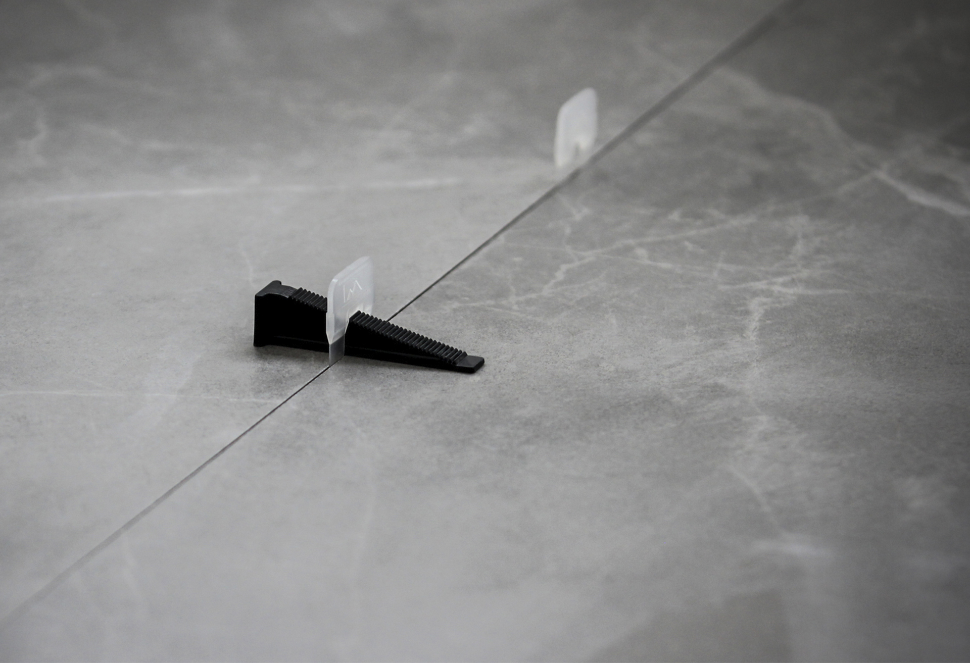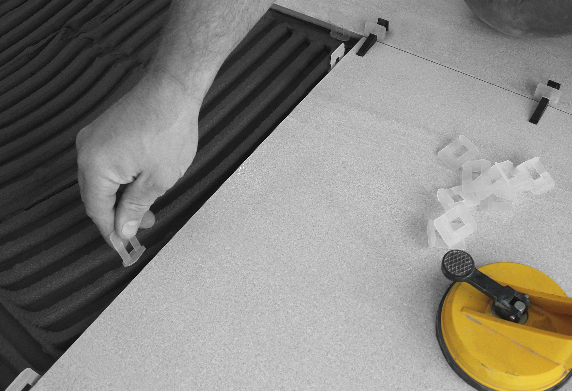 - При сложной раскладке и неровной плитке количество зажимов нужно увеличить. В зависимости от длины, кривизны и формы плитки нужно установить зажимы в 5 см от края плитки и далее примерно через каждые 20 см по длине плитки (на усмотрение мастера).