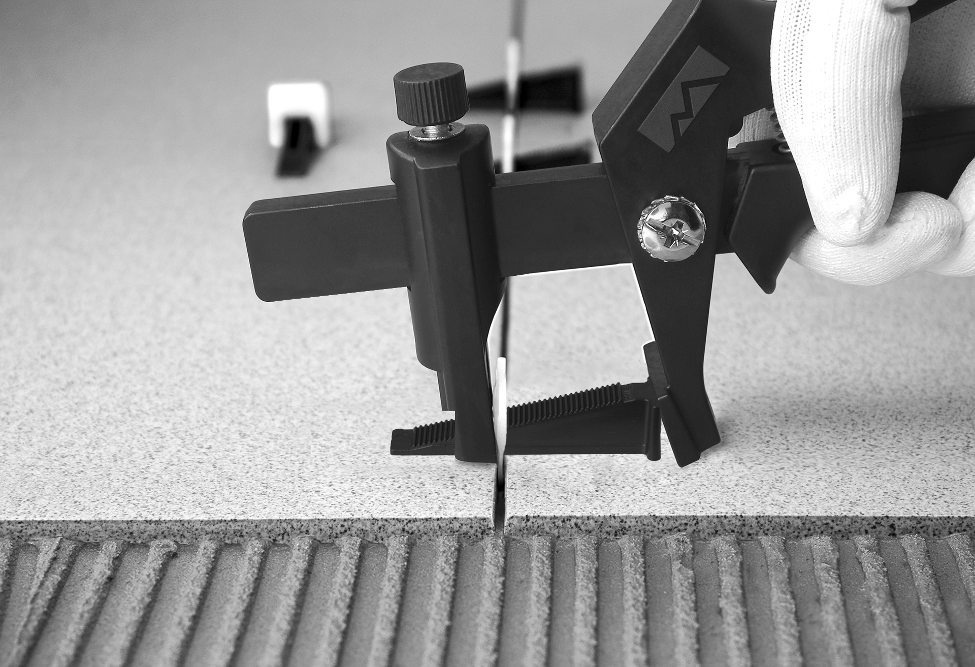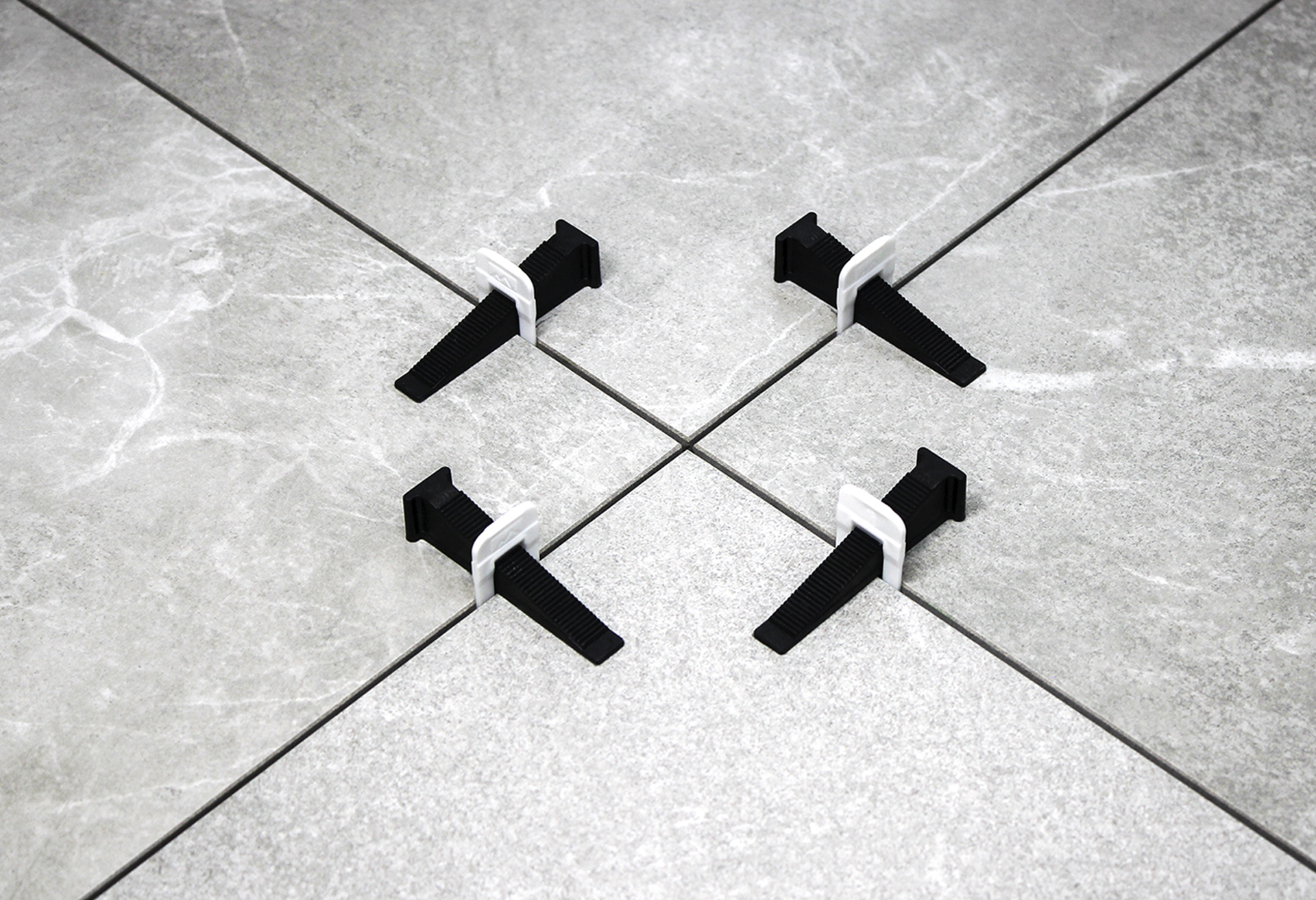 - При сложной раскладке и неровной плитке количество зажимов нужно увеличить. В зависимости от длины, кривизны и формы плитки нужно установить зажимы в 5 см от края плитки и далее примерно через каждые 20 см по длине плитки (на усмотрение мастера).