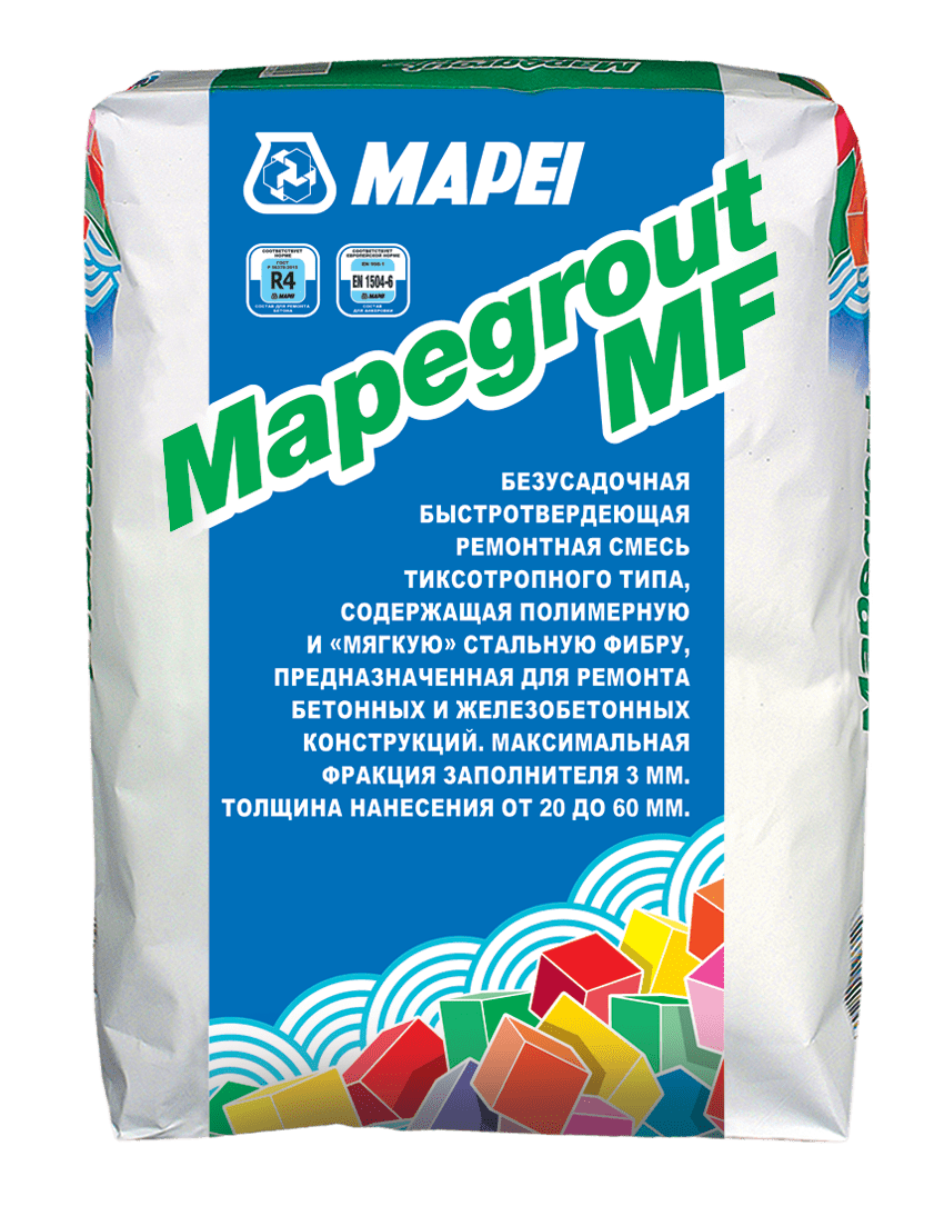 Mapegrout MF соответствует требованиям стандарта EN 1504-3 («Конструкционный и неконструкционный ремонт») для ремонтных растворов класса R4.