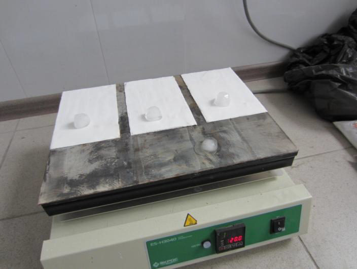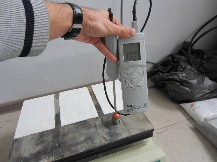 На плиту установим пластину с нанесенной сверхтонкой теплоизоляцией Броня и доведем температуру на необработанной поверхности до 100 °С.
