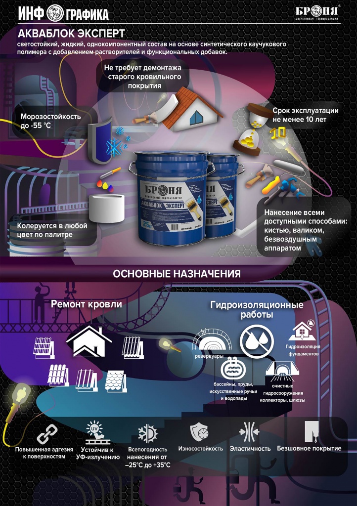 Представляем Вам всепогодное, светостойкое, жидкое, однокомпонентное, гидроизоляционное покрытие на основе синтетического каучукового полимера с добавлением растворителей и функциональных добавок - БРОНЯ АКВАБЛОК ЭКСПЕРТ и БРОНЯ АКВАБЛОК ЭКСПЕРТ НГ.