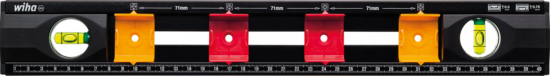 При монтаже розеток у пола обычно пузырёк уровня плохо виден. Кроме того, линии разметки по уровню часто имеют некрасивые разрывы из-за выемок на его поверхности, в которых находятся ампулы уровня. Уровень Wiha для электриков покончил с этими проблемами. Пузырьки уровня прекрасно видны даже при остром угле зрения. Кроме того, благодаря сплошному корпусу возможна разметка непрерывными линиями. Даже при взгляде сверху правильно расположенные шкалы позволяют удобно выполнять разметку. Ещё одним преимуществом при электромонтаже являются переменные расстояния между метками для разметки до 4 розеток скрытой проводки. Благодаря смещаемым точкам разметки розеток уровень можно регулировать в соответствии с местными требованиями к расстояниям между электрической арматурой, что обуславливает его разностороннее и международное применение. Благодаря компактной форме он очень удобен в разъездной работе и прекрасно укладывается в чемодан Wiha для электриков.