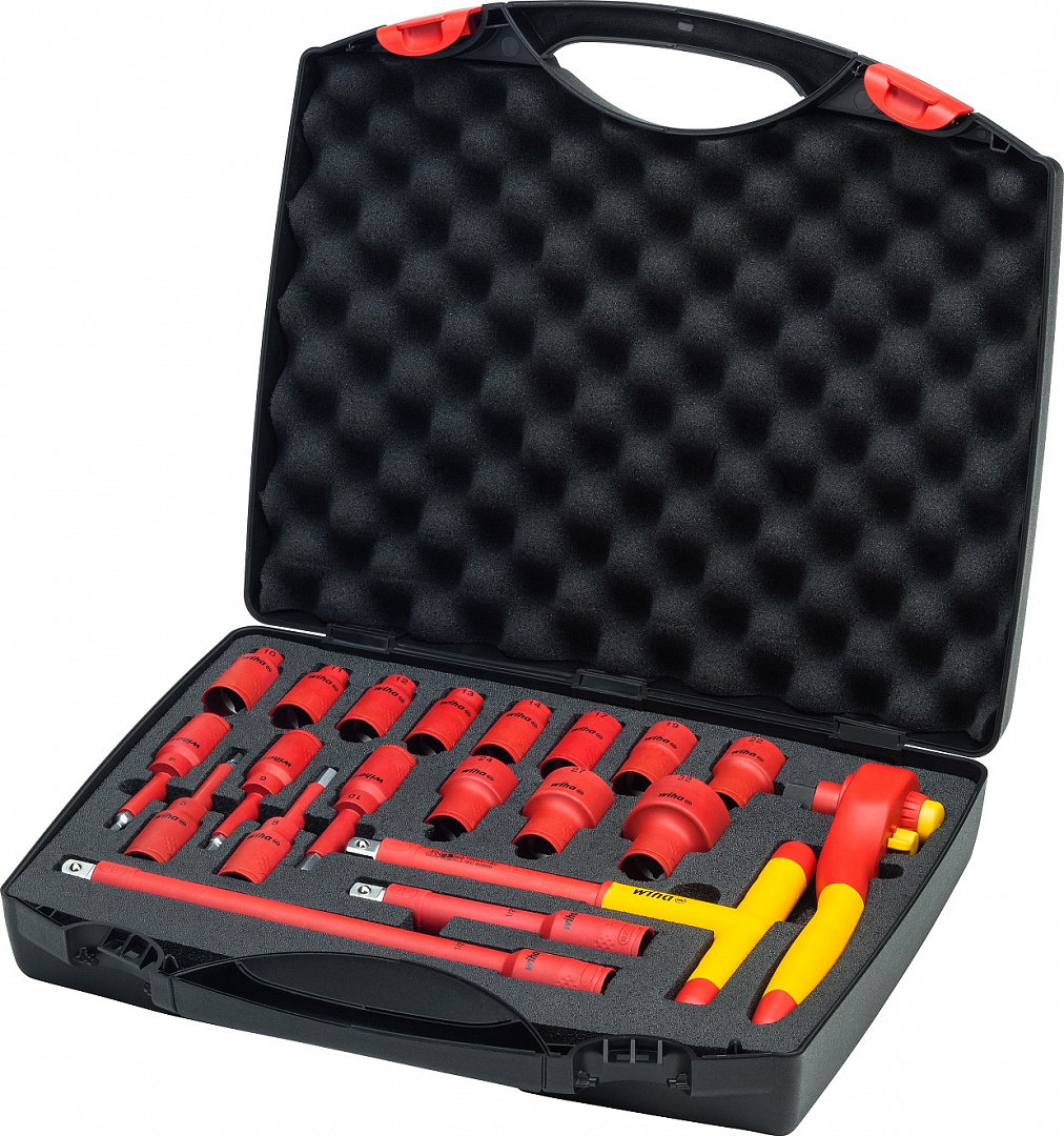 При работах с токопроводящими частями, безопасность человека стоит на первом месте. С набором инструментов, включающим в себя ключ с трещоткой, Т-образную рукоятку с переходником и торцевые ключи, электрики лучше всего оснащены для работ с электрооборудованием. На прилагаемом ключе с трещоткой с правым/левым вращением, замена торцевых головок является простым делом. При нажатии на кнопку торцевые головки механически блокируются. Для расширения возможностей, в набор включена Т-образная рукоятка с переходником electric. С ней можно без труда достать до глубоко расположенных винтов. Кроме того, выбор бит с торцевыми головками с наружным и внутренним шестигранником и удлинителями придаёт потребителю необходимую гибкость в выполнении работ. Ключ с трещоткой, поперечная рукоятка, торцевые ключи и удлинители наглядно расположены в практичном и прочном чемодане. Инструменты в наборе подвергаются поштучным испытаниям в соответствии с международным стандартом IEC 60900 и позволяют безопасно работать с деталями, находящимися под напряжением до 1000 В ~.