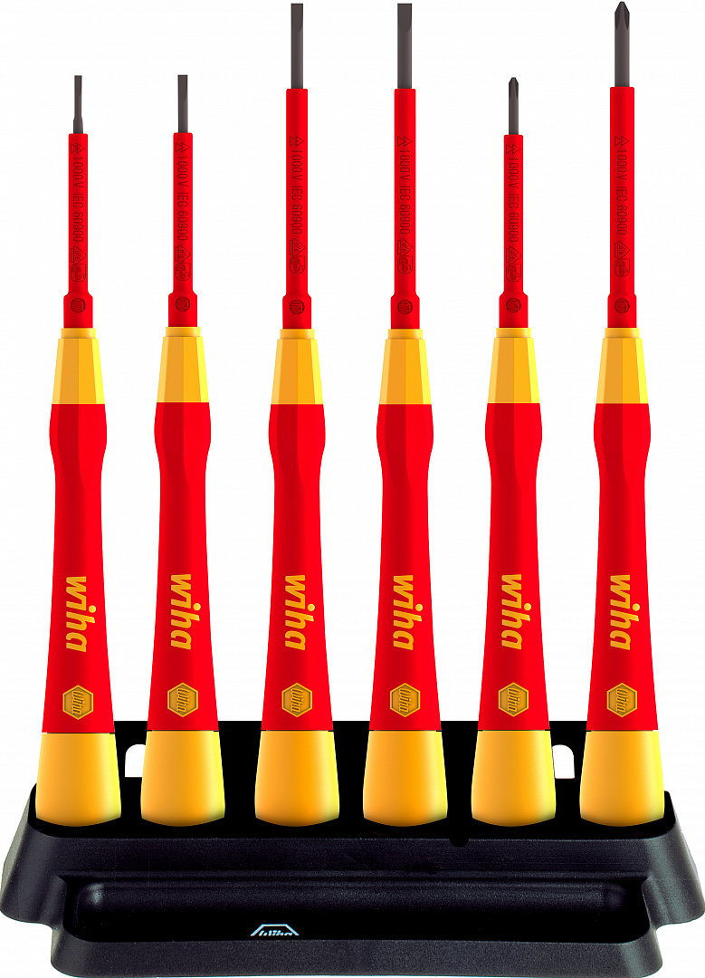 Основное требование к выполнению резьбовых соединений в точной механике заключается в том, чтобы работать выверенно и точно, не повреждая детали. Микроотвёртки Wiha PicoFinish, благодаря длинной тонкой рукоятке и крутящемуся колпачку, прекрасно подходят для выполнения точных и филигранных работ в электрике и точной механике, а также в области хобби и изготовлении моделей. Благодаря эргономичной форме рукоятки с мягкой зоной, отвёртка очень удобна в использовании. Чувствительное и быстрое вращение поддерживается легко вращающимся колпачком. Кроме того, знак на колпачке облегчает выбор правильного профиля отвёртки. Изолированные микроотвёртки подвергаются поштучным испытаниям в соответствии с международным стандартом IEC 60900 и позволяют безопасно работать с деталями, находящихся под напряжением до 1000 В ~. В набор входят 6 микроотвёрток PicoFinish и один держатель. С ним можно аккуратно хранить микроотвёртки на рабочем месте.