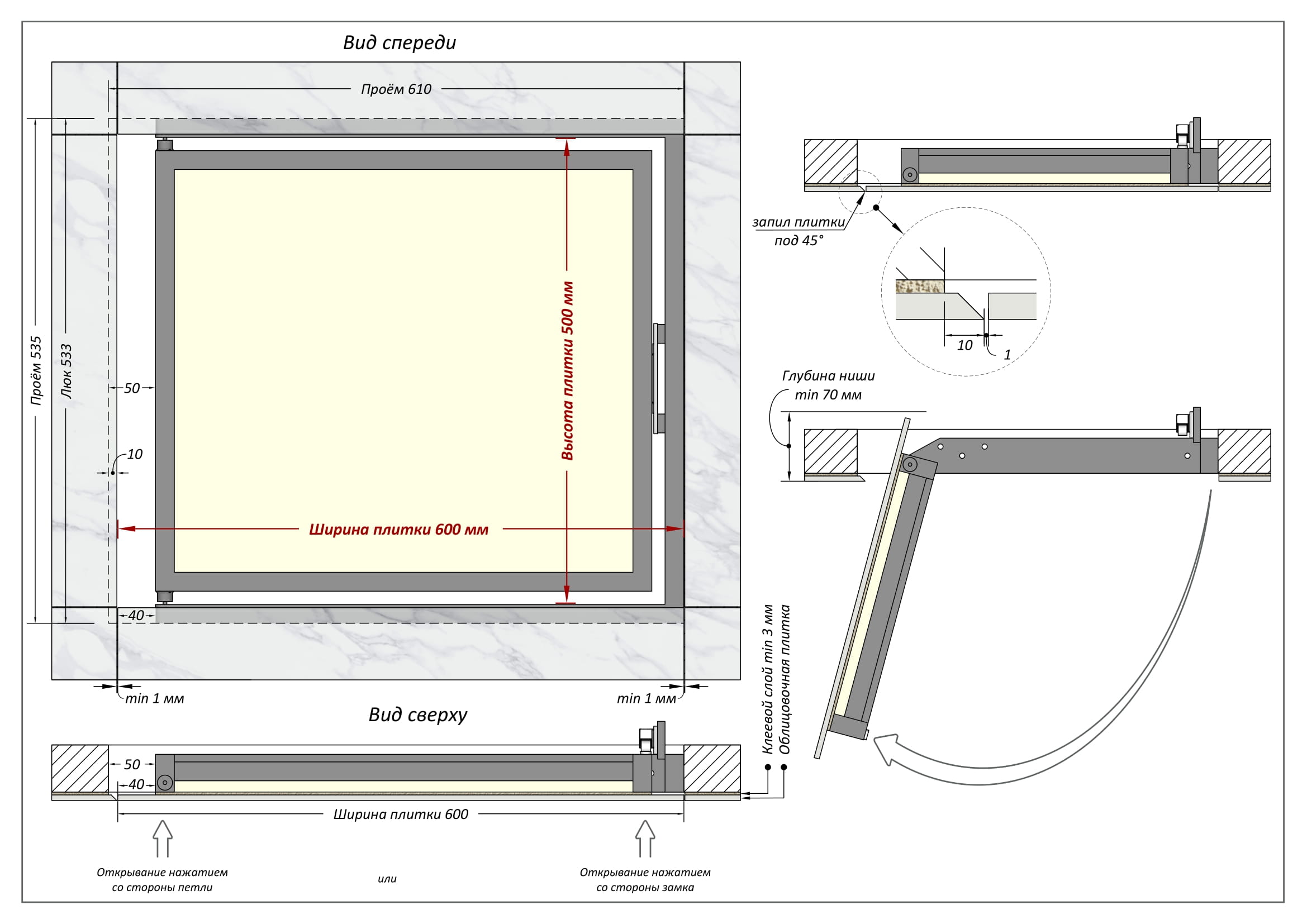 - ревизионный люк под плитку 60 на 50 см открывается легким нажатием со стороны замка, либо со стороны петель;