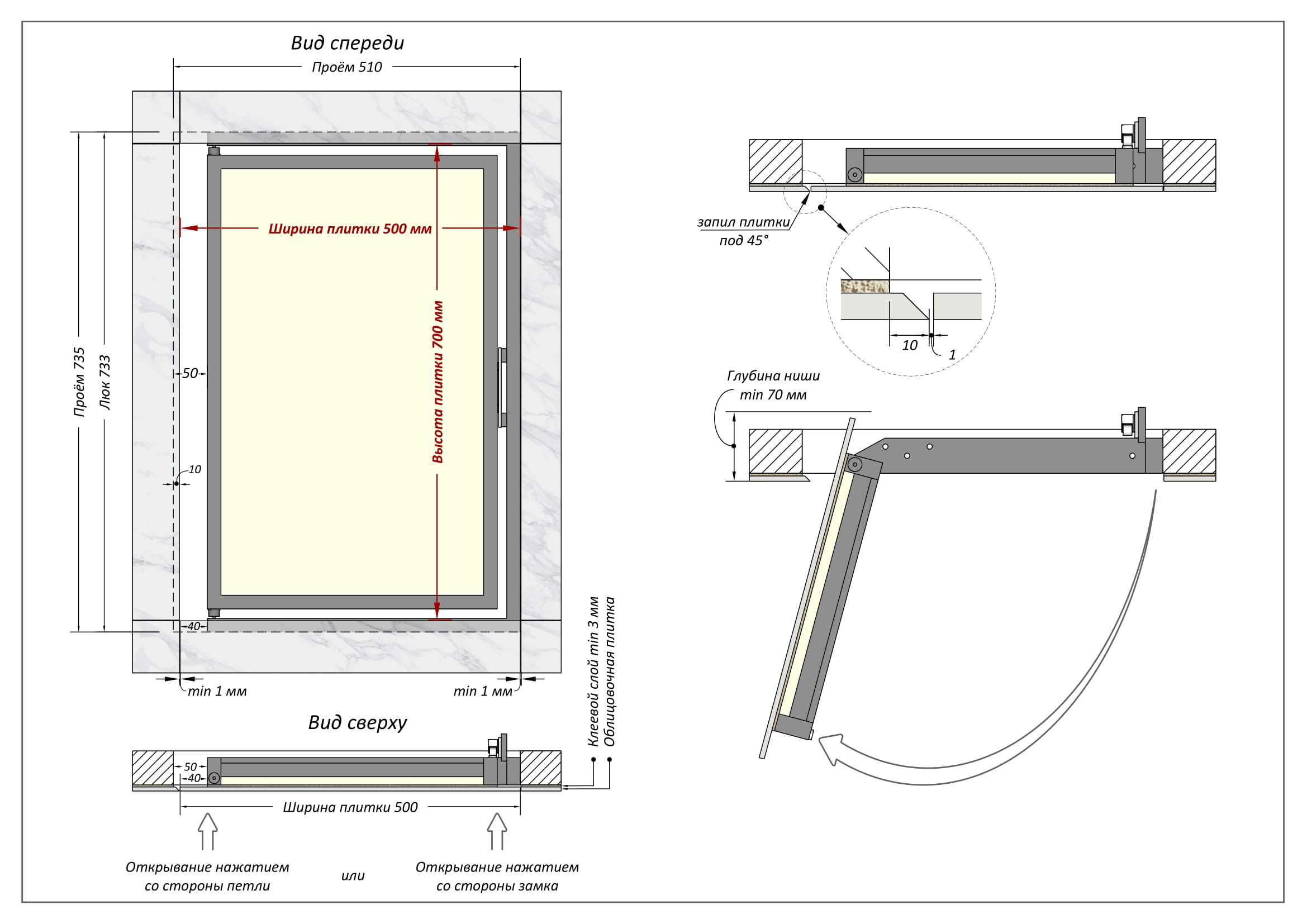 - люк сантехнический 500х700 открывается легким нажатием со стороны замка, либо со стороны петель;