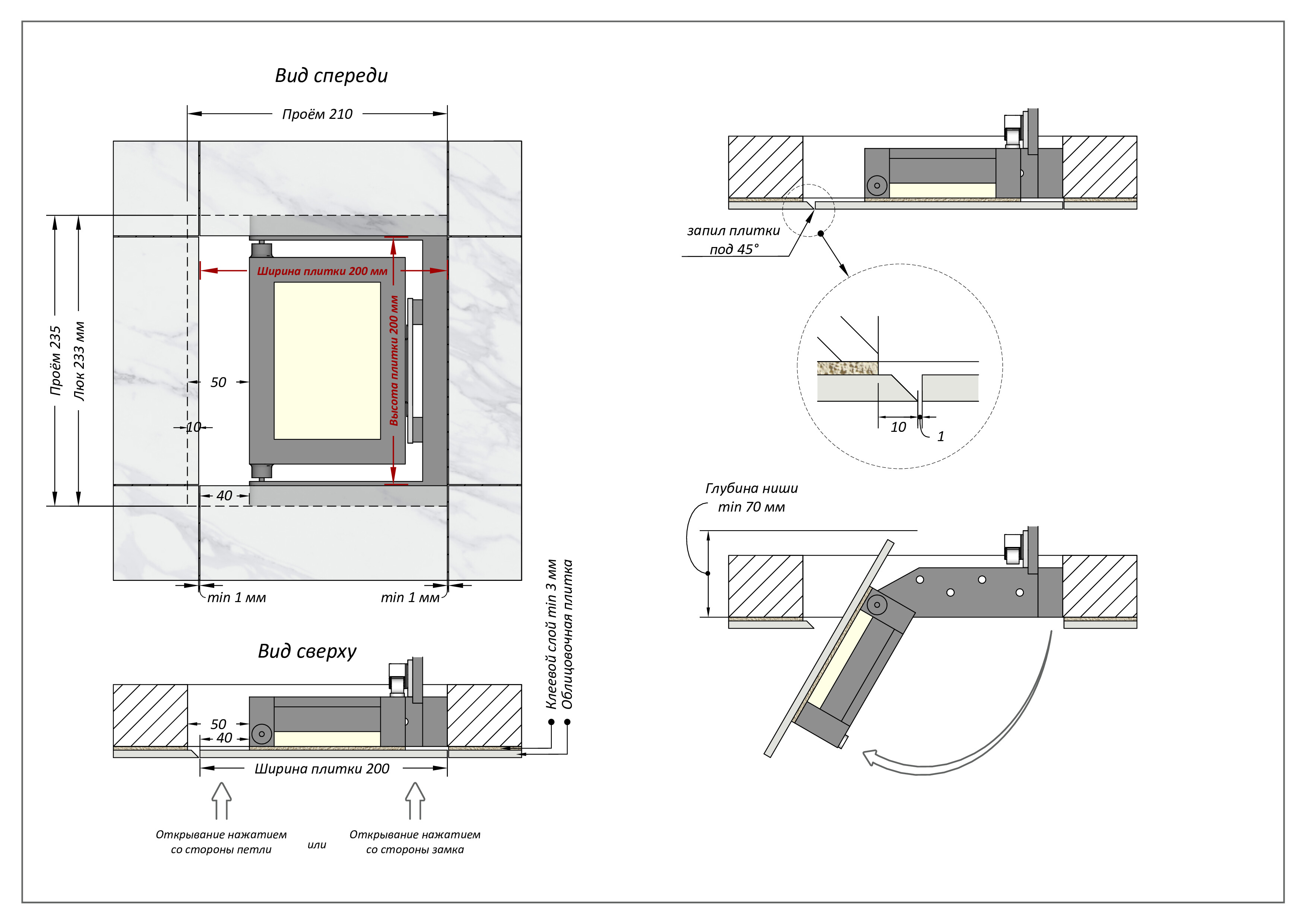 - люк сантехнический 200х200 открывается легким нажатием со стороны замка, либо со стороны петель;