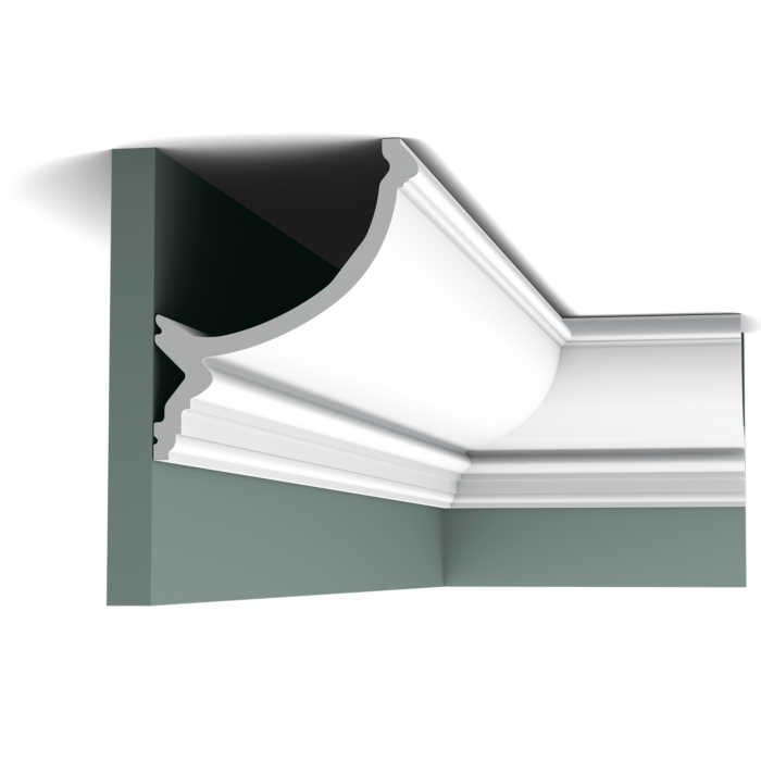 Большой карниз, навеянный формой Оволо. Плинтус для любого интерьера. Примечания: Примечания: Используйте экстра сильный  для крепления высоких профилей для скрытого освещения, а также массивных карнизов для штор.