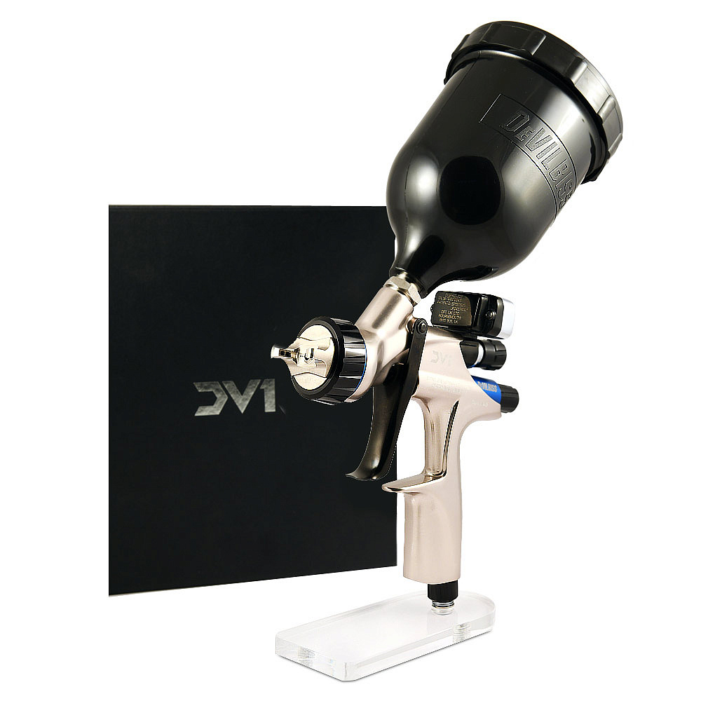 Универсальная конструкция корпуса краскораспылителя Devilbiss DV1, позволяет использовать его с двумя воздушными головами и наносить любые лакокрасочные материалы с превосходным качеством.