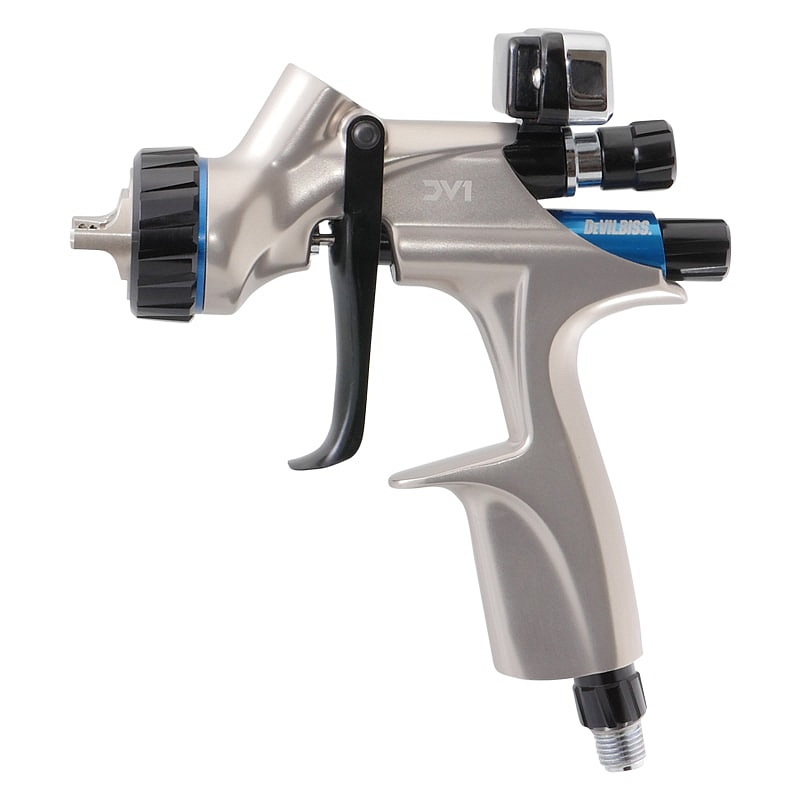 Универсальная конструкция корпуса краскораспылителя Devilbiss DV1, позволяет использовать его с двумя воздушными головами и наносить любые лакокрасочные материалы с превосходным качеством.