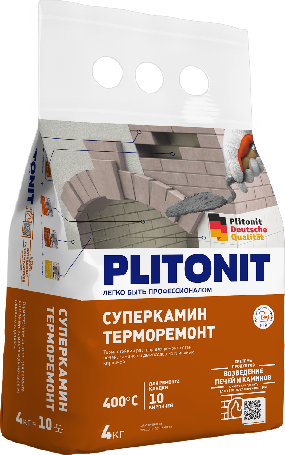 Для кладки, ремонта и оштукатуривания шамотного кирпича используйте PLITONIT СуперКамин ОгнеУпор.. Для облицовки печи или камина используйте термостойкий клей для плитки PLITONIT СуперКамин ТермоКлей.