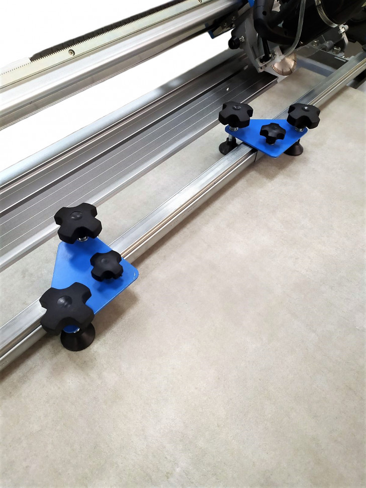 Прижимная планка предназначена для выравнивания широкоформатной плитки относительно плоскости рабочего стола. Прижим осуществляется благодаря конструкции с боковыми струбцинами и прижимными каретками на самой направляющей. У кареток имеется возможность перемещения вдоль всей направляющей, чтобы найти наиболее удачные места для прижима